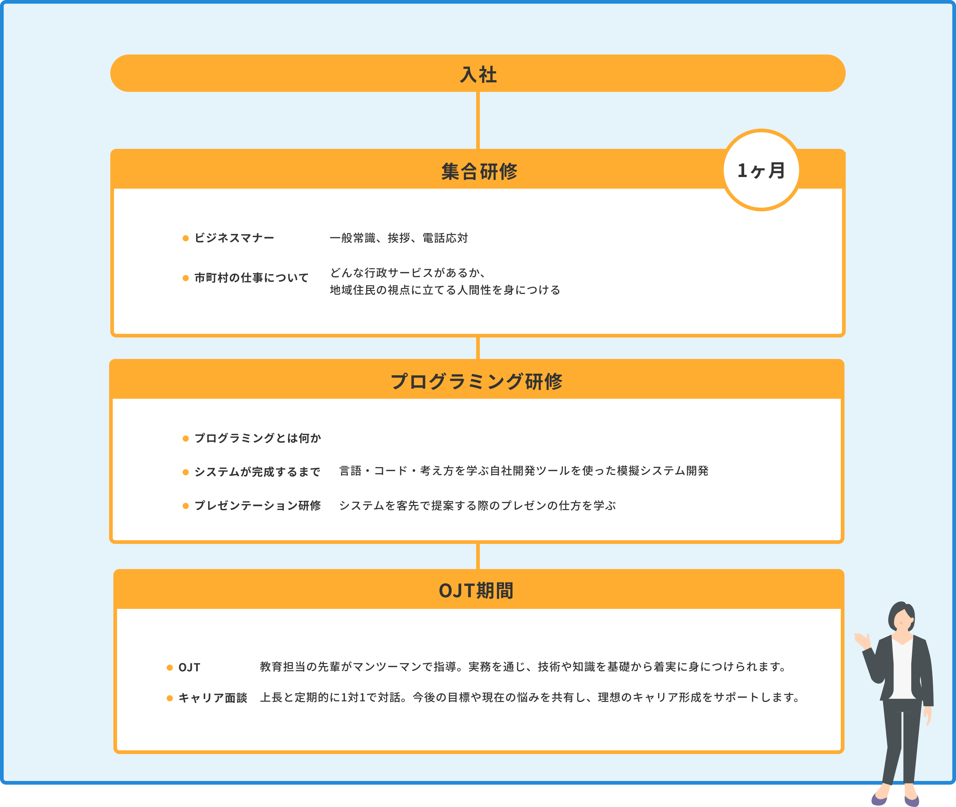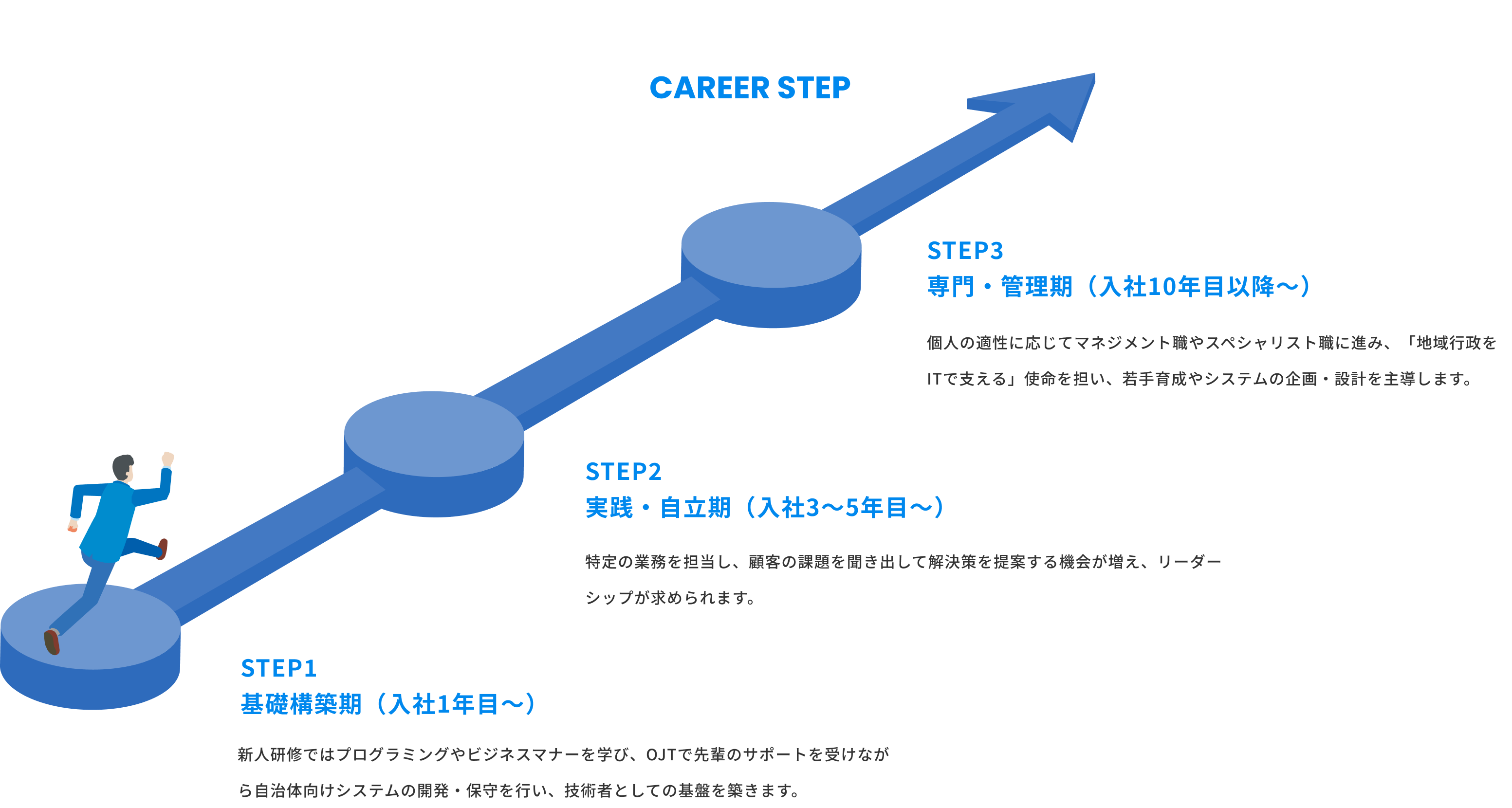 自治体向けのシステムを主力としているため、技術力はもちろん「公共業務への深い理解」がキャリアアップの大きな鍵となります。また、文系出身者向けの定期的な勉強会もあり、着実にステップアップできる環境が整っています。
